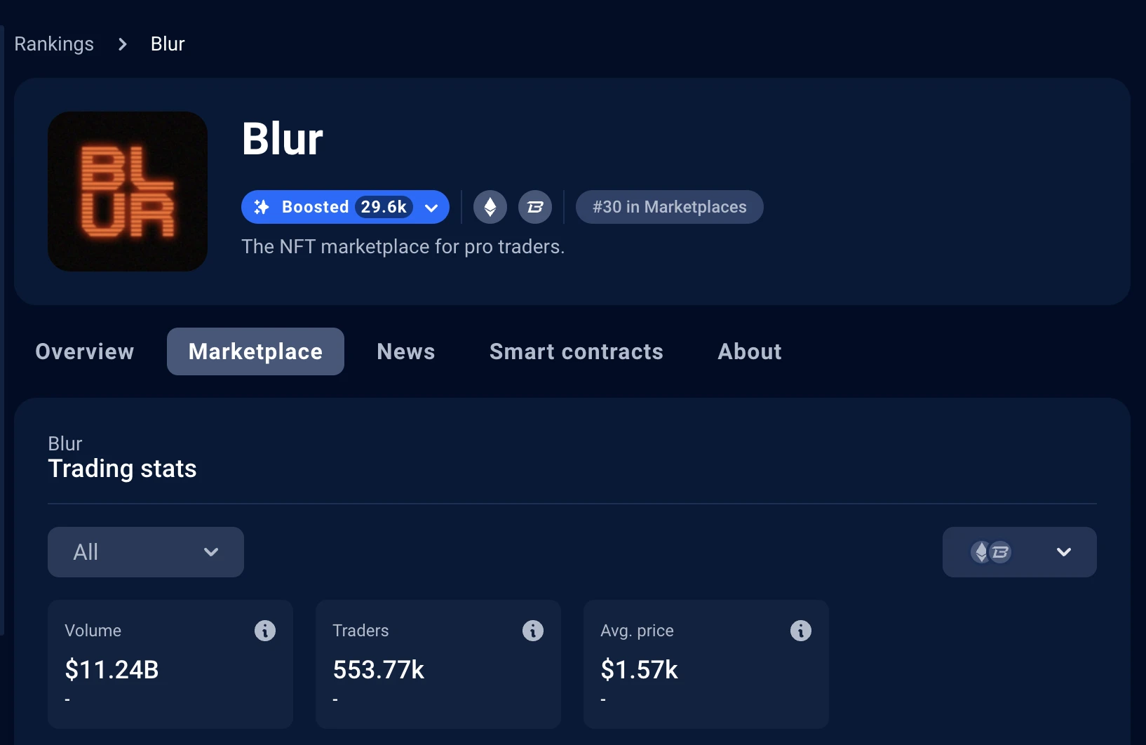 目前,据 DappRadar 网站数据 显示,Blur 交易总额超 112.4 亿美元,交易者数量高达 55.377 万,但活跃的 NFT 交易者早已“人去楼空”。