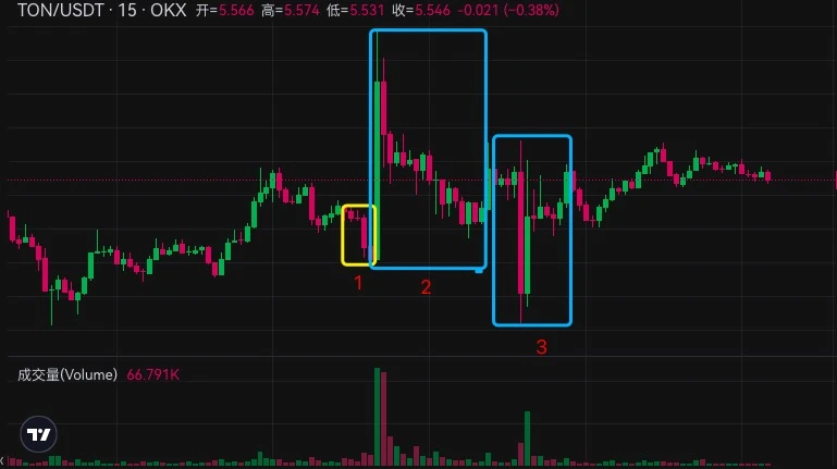 消息一出,Toncoin 行情走低,Toncoin 行情走势图中标注 1 的位置,该阶段跌幅达 3% ,价格跌至 5.3 USDT。本次行情跌幅可以理解,Pavel Durov 即将面临法院指控,投资者小规模抛售。