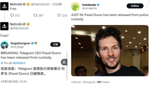 本以为需要等待 Pavel Durov 的法庭指控结果,但不曾想以 X 平台为首的社交媒体上充斥着 Pavel Durov 获得自由的消息,几乎每分每秒都有用户在社媒上表达 Pavel Durov 被释放的喜悦言论,就连不少加密项目方都纷纷发文。