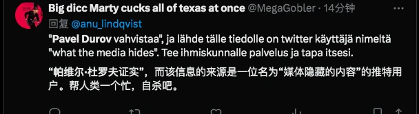 在谈论 Durov 被捕的真实原因时,Mike Benz 认为:“俄罗斯在被制裁后,通过 Telegram 对乌克兰实施监控,同时俄罗斯将 Telegram 作为对外言论管控的工具,例如中东和非洲等,这其中 Telegram 的作用显而易见。”