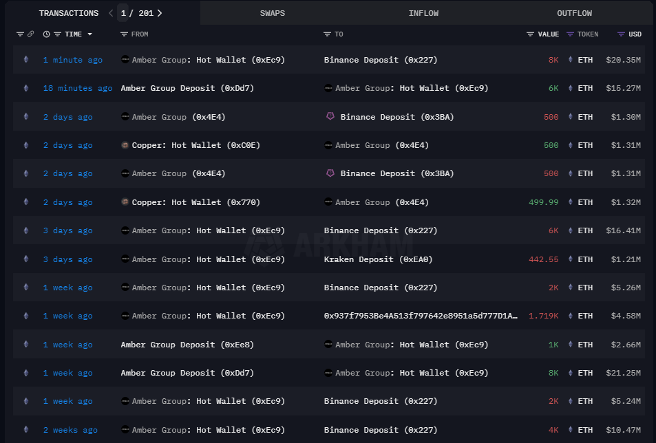 根据 Arkham 数据显示,Amber Group 刚刚向 Binance 存入了 8,000 枚 ETH,市值约为 2,035 万美元,更值得关注的是,在过去的一个月内,Amber Group 已累计向交易所 Binance 存入了 57,000 枚 ETH,总价值达到约 1.5619 亿美元。