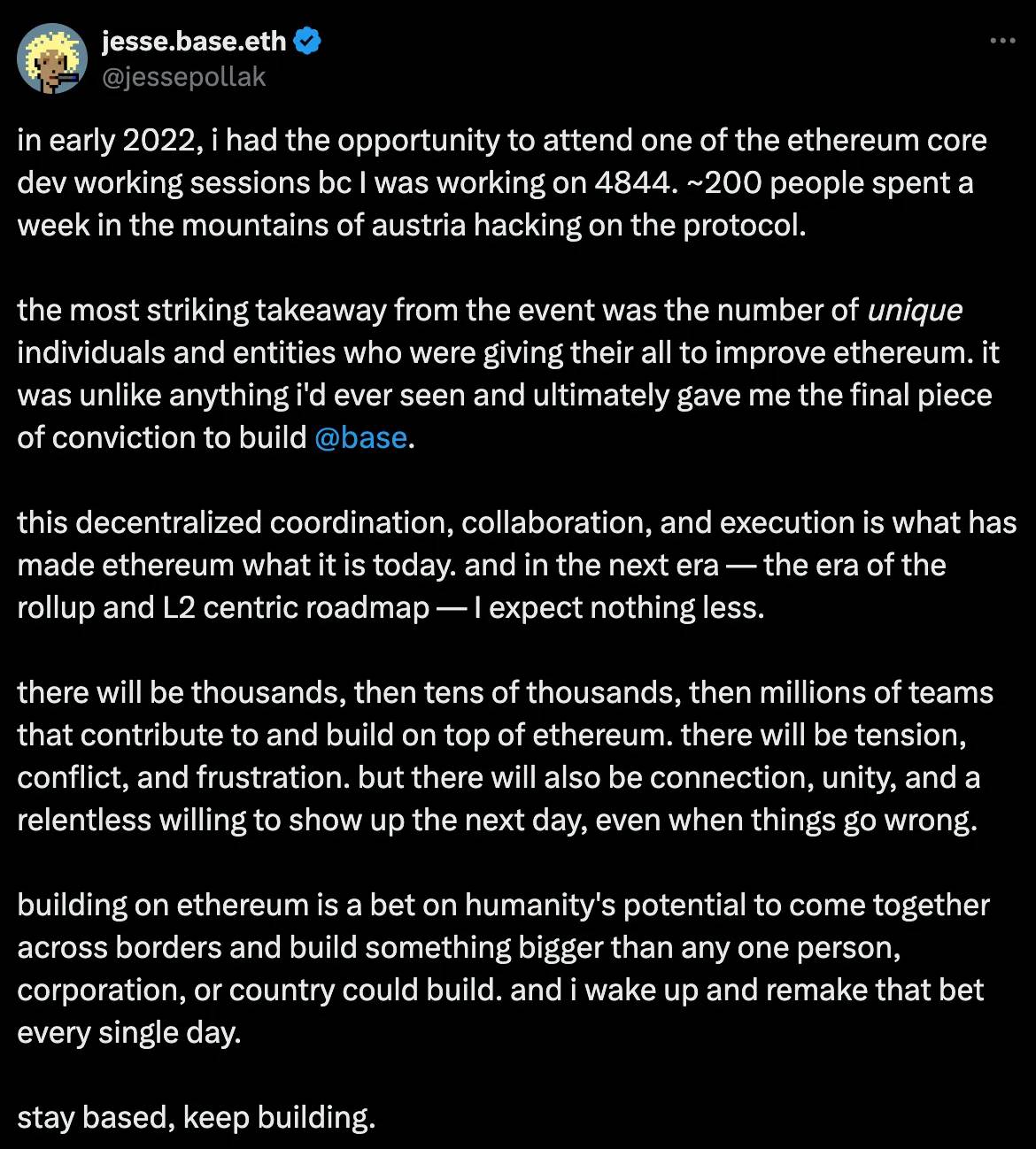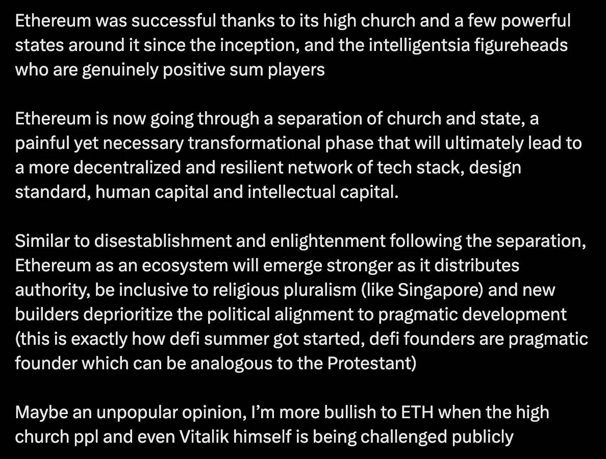 以太坊现在正经历教会与政府的分离,这是一个艰难但必要的转型阶段,最终将导致一个更加去中心化和更具韧性的技术栈、设计标准、人力和知识资本网络。