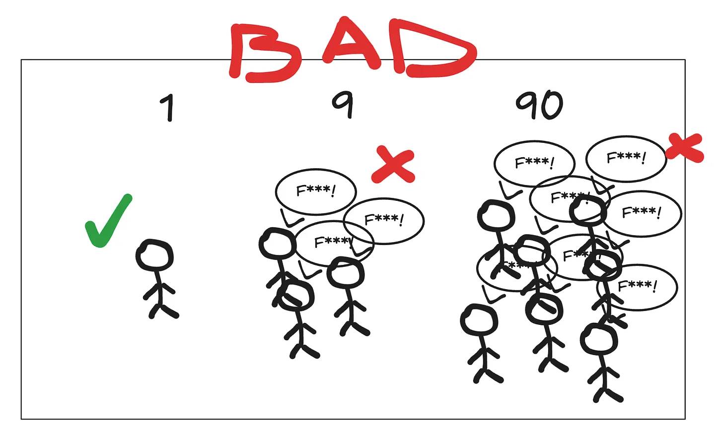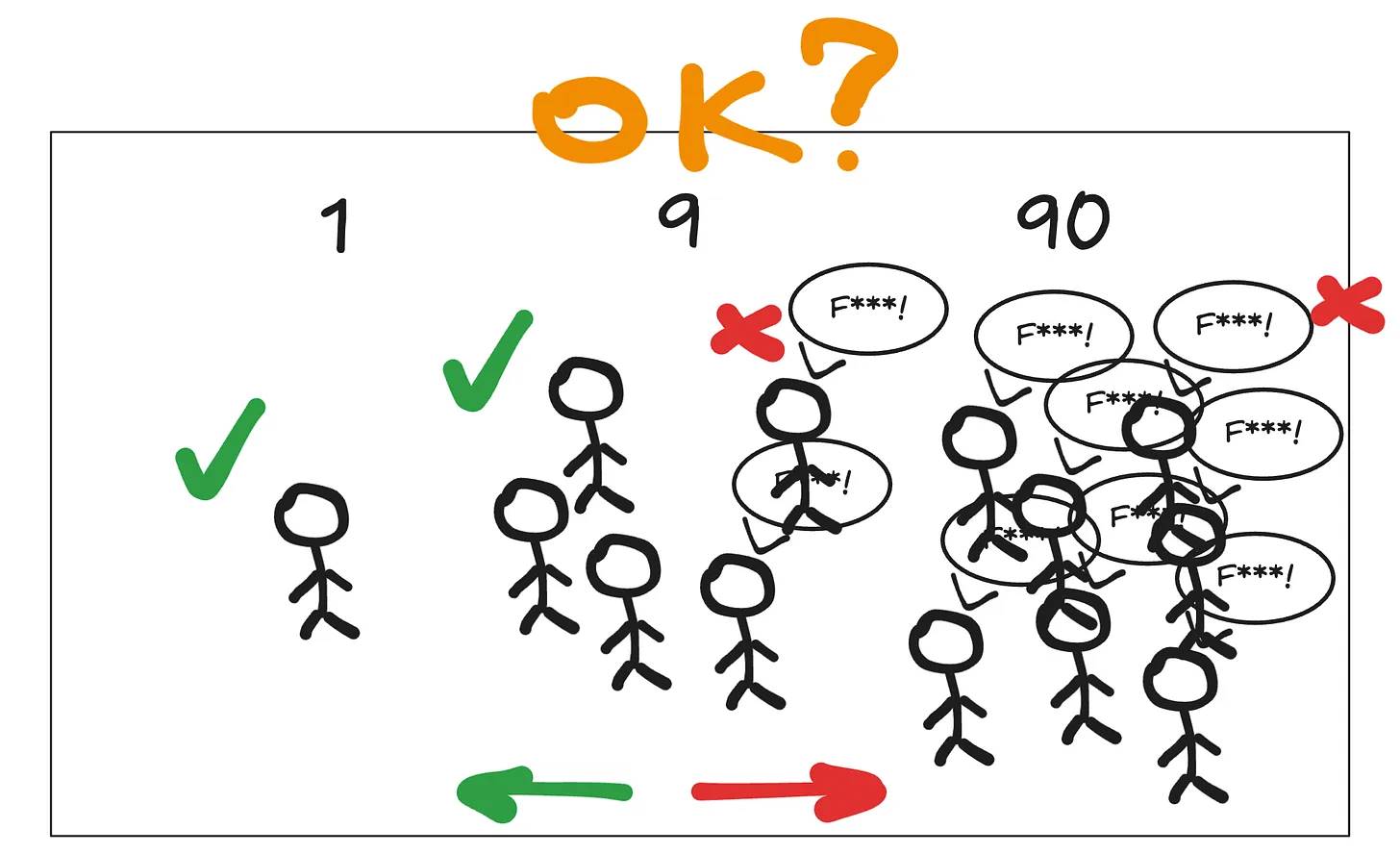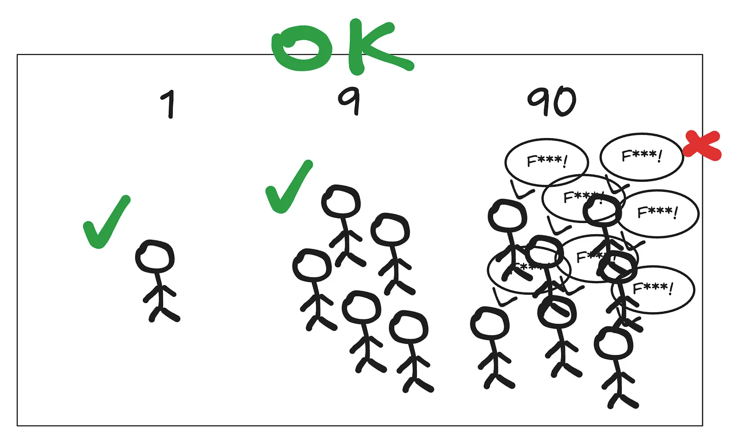 无论如何,当 9% 的人过于自我陶醉时,问题就出现了。这种情况发生在他们只和 1% 的人待在一起,忘记与 90% 的人核实现实。然后你最终会得到开发者精英主义的封闭聚会,没人能从中受益。重要的是要关注现实,否则每个人都会受到影响。