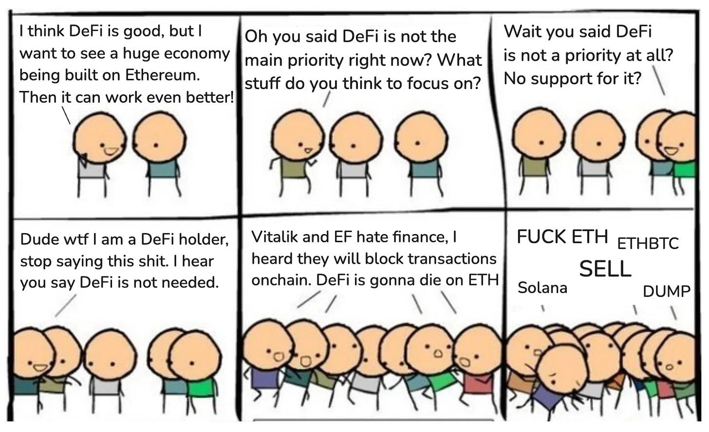 在过去几天,以太坊社区内部出现了许多争议和不满。这并不奇怪;人们只是感到困惑,无法找到表达困惑的方式。他们在上一个周期以来已经工作了 3 年多,但没有新的交易量或用户来购买他们的资产,所以每个人都感到沮丧。这只是一个事实。我并不是在提出原因或解决方案——那是另一篇文章的内容。这里我只是在陈述现状。