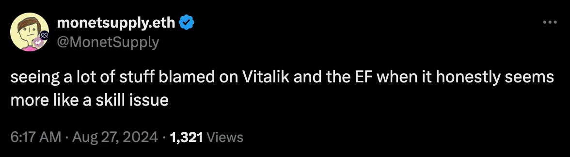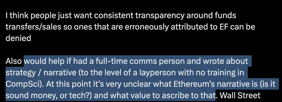 我并不是在保护我的资产,因为这篇文章不会影响任何人。我乐于看到并接受存在的结构性问题,但除了“某个 EF 成员获得了一些顾问职位”和“EF 卖出了一些 ETH,这不到总流通量的 0.1% ”之外——我看不到更多的论据。你们可以做得更好。