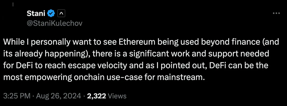 DeFi 的创始人没有要求他的祝福或 EF 的支持。事实上,最初是通过他们的反对意见来构建的。然而,DeFi 依然生存并发展,那么现在为什么还要请求任何祝福呢?需要注意的一点是,只要他们不进行一些核心协议的更改,使得 DeFi 的可用性下降,一切都很好。例如,某些对 DeFi 至关重要的操作的 gas 成本。基本上是以 DeFi 的可用性和增长为代价去追求他们的大愿景。