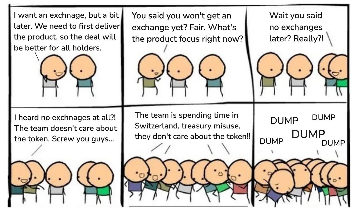 你以前见过这样的对话,对吧?这就是每个项目在 Discord、Telegram 和 Twitter 上的聊天情况。我可以向你保证,在这场对话中,双方都互相不满。持币者在开发者看来是个要求快速拉升和抛售的普通人。与此同时,开发者在持币者看来则是个建造空中楼阁的精英混蛋。