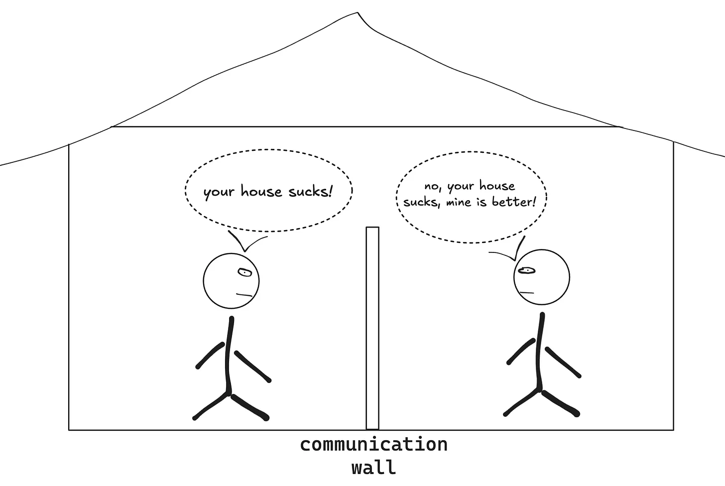 沟通的障碍就是正在发生的事情。以太坊基金会和大脑开发者过于关注未来,因此听起来好像他们不关心今天的问题。尽管他们确实关心,但他们的思考已经走得更远。这对另一方来说是个困难的事情,因为他们对所有的思维和思考过程没有那么多的背景了解。你最终得到的是:(如下图的沟通墙)