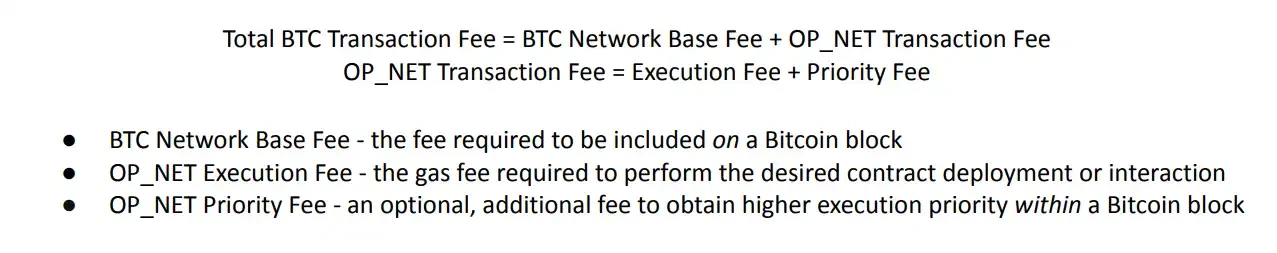 OP_NET 的交易费用由两部分组成,第一部分自然是作为一笔比特币交易最基本的比特币网络费用,另一部分则是 OP_NET 交易费,而 OP_NET 交易费又由执行费和优先级费组成,这两部分费用都是用比特币来进行支付的。OP_NET 交易费必须多于 330 聪以确保不会被视为「粉尘」(过小的 UTXO)而被节点拒绝接收,优先级费则使合约执行动作可以像以太坊那样拉高 Gas 以确保自己的交易被优先执行(OP_VM 可以对优先执行哪个动作进行排序)。