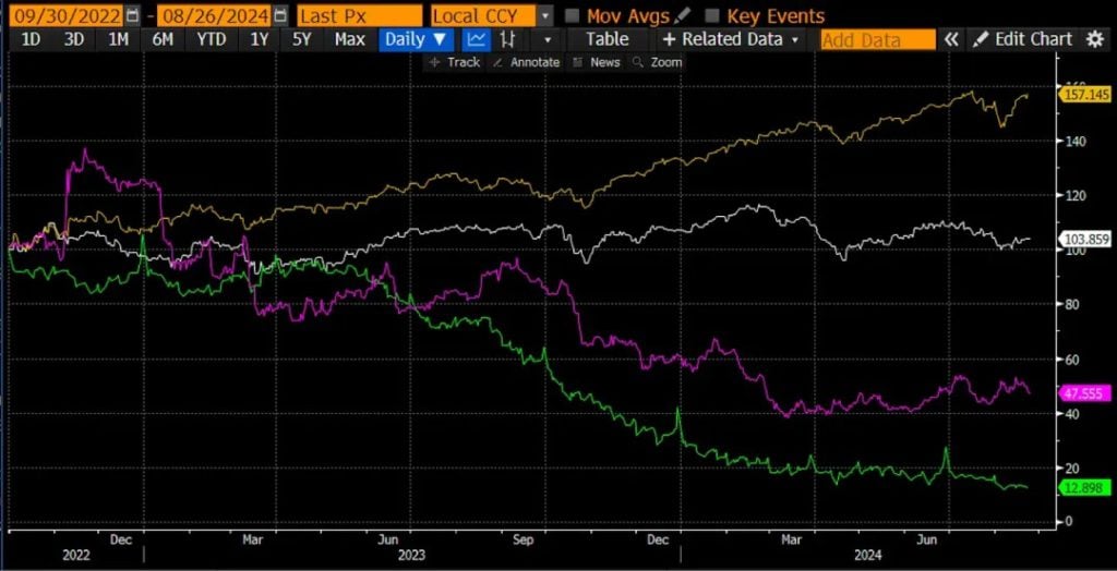 所有价格都以 2022 年 9 月 30 日的 100 为基準;这是 RRP 的峰值,约为 2.5 兆美元。RRP(绿色)下降了 87%。标普 500 指数(黄金色)以法币美元计价的名义收益上涨了 57%。我继续宣告,美国财政部比美国联準会更强大。