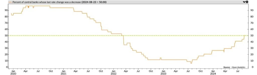 在美国联準会的带领下,全球中央银行正在降低货币价格。美国联準会在通膨高于目标且美国经济持续增长的情况下仍在降息。英国央行(BOE)和欧洲央行(ECB)很可能在即将召𫔭的会议上继续降息。