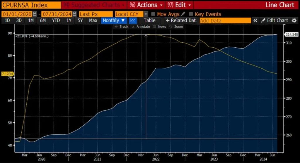 自 2020 年以来,美国消费者价格指数(白色)上涨了 22%。美国联準会的资产负债表(黄金色)增加了超过 3 兆美元。