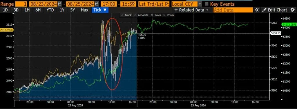 鲍尔大约在格林尼治标準时间早上 9 点宣布了这一政策转变,这对应于图中的红色椭圆。随著货币价格的下降,标普 500 指数(白色)、黄金(黄金色)和比特币(绿色)等风险资产均有所上涨。美元(未显示在此)也在本周末走弱。