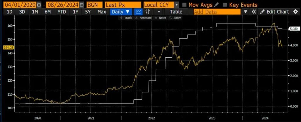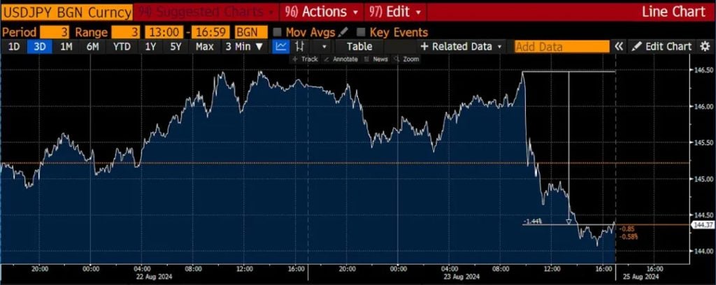 这是之前的美元兑日元汇率图。我想再次强调,在鲍尔确认 9 月降息板上钉钉之后,日元有所升值。