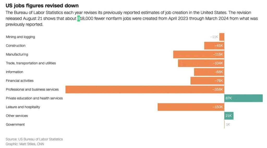 鲍尔的政策转向是基于一份糟糕的就业报告。就在鲍尔在杰克逊霍尔发表演讲前几天,美国总统拜登的劳工统计局(BLS)释出了对之前就业资料的令人震惊的负面修正。他们指出,之前的就业估计值超出了约 80 万个职位。