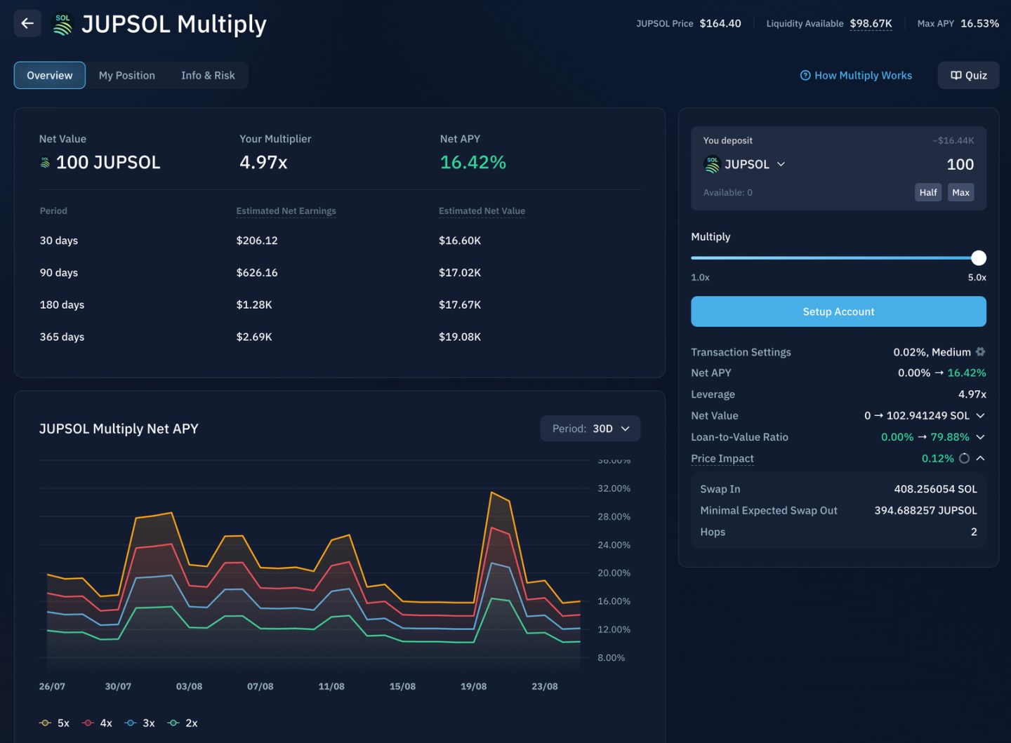 目前,使用 JupSOL LST 可以获得最高收益,其 APY 为 8.3% ,循环 5 次上述操作可获得高达 16.4% 的 APY。这种策略可以使用 Kamino Multiply 自动完成,用户只需存入 SOL 或 JupSOL 即可。