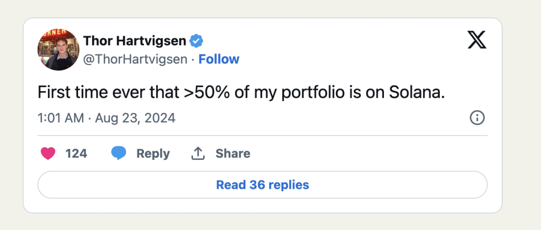 几天前,我在推特上发帖称,「我个人链上投资组合的 50% 以上都在 Solana。」这条推文比我最初预期的更具争议性,并引发了一系列有趣的回复,例如「我不怕上帝,我就怕这个」。