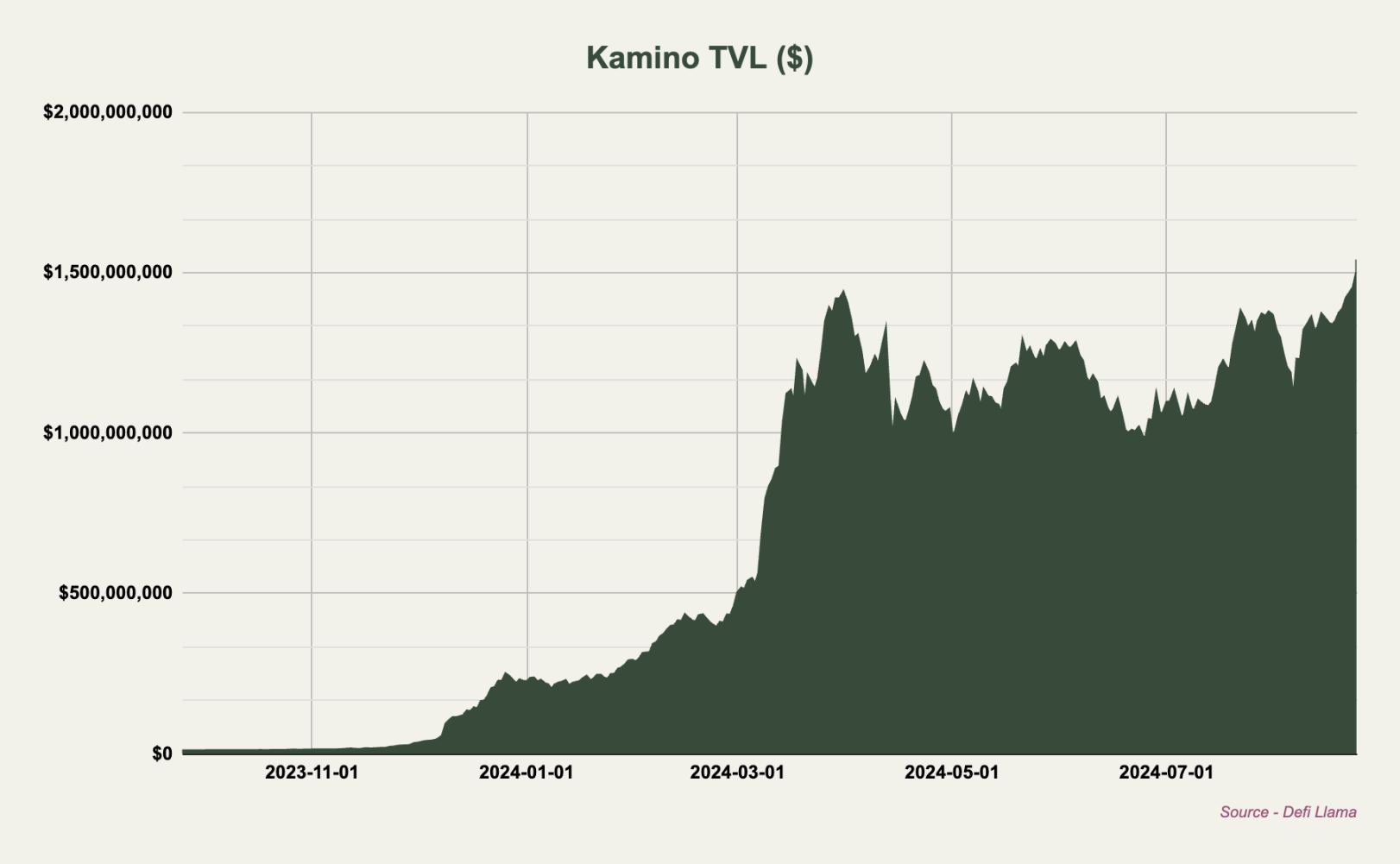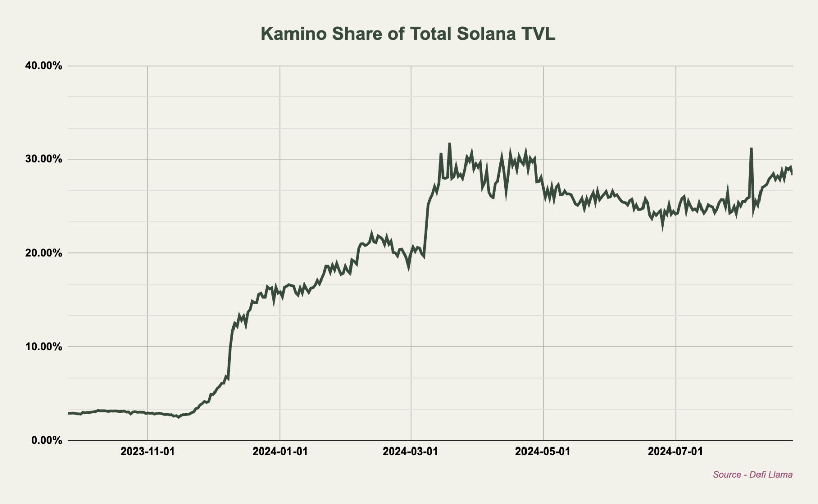 Kamino 是 Solana 上的首选货币市场,也是仅次于 Jito 的第二大 TVL 应用。Kamino 的 TVL 超过 15 亿美元,占 Solana 所有流动性的近 30% 。