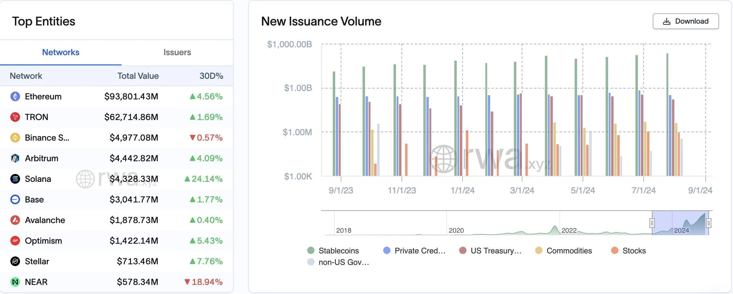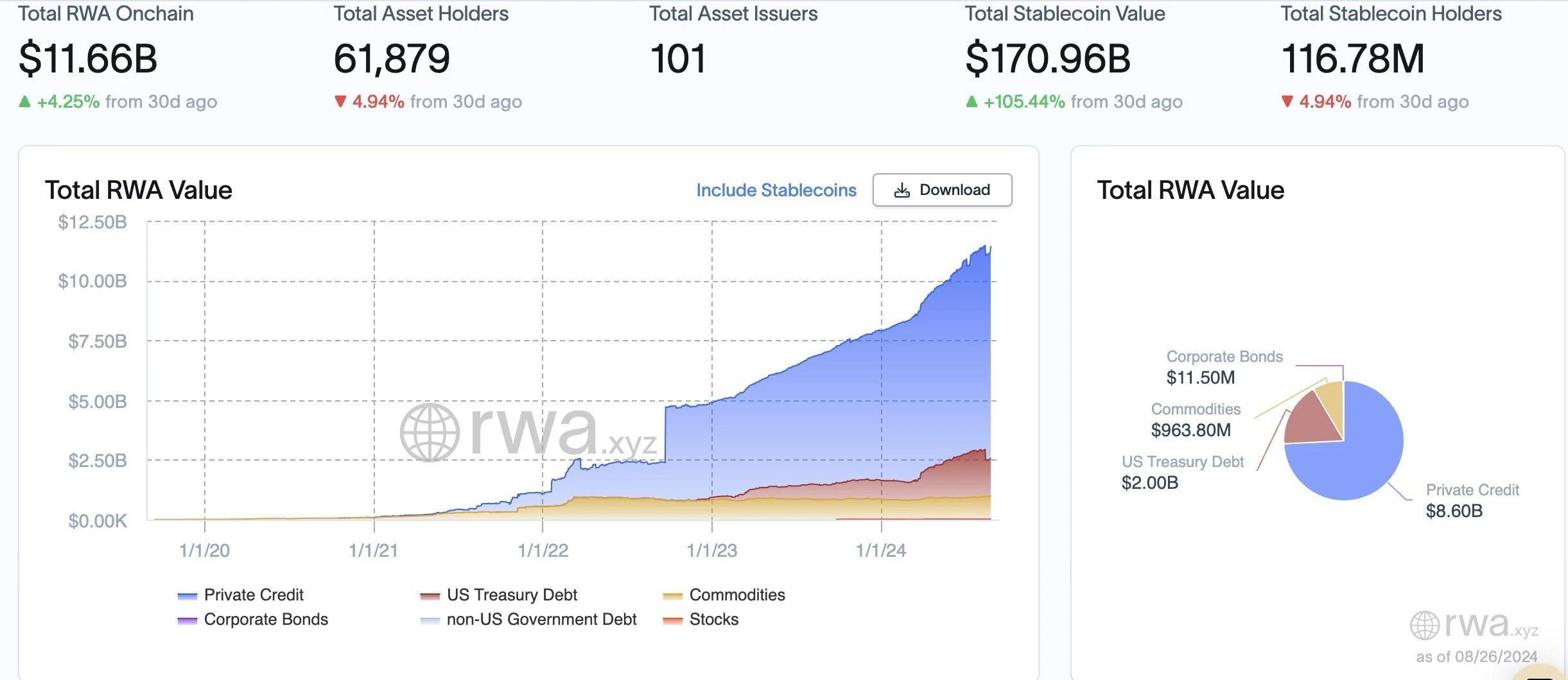 收益化(生息、固收)RWA 的增长迅猛。2024 年至今,非稳定币 RWA 的链上价值增加了 41.1 亿美元,大多来自国债、私人信贷和房地产代币。当前的整体增长和生态完善主要归因于以下三个方面: