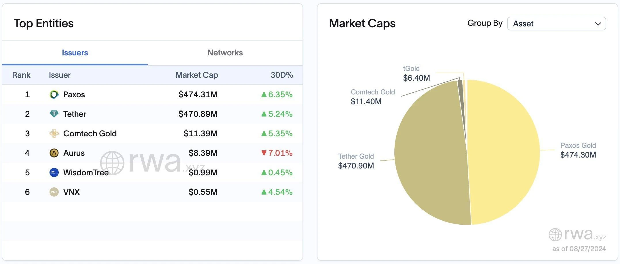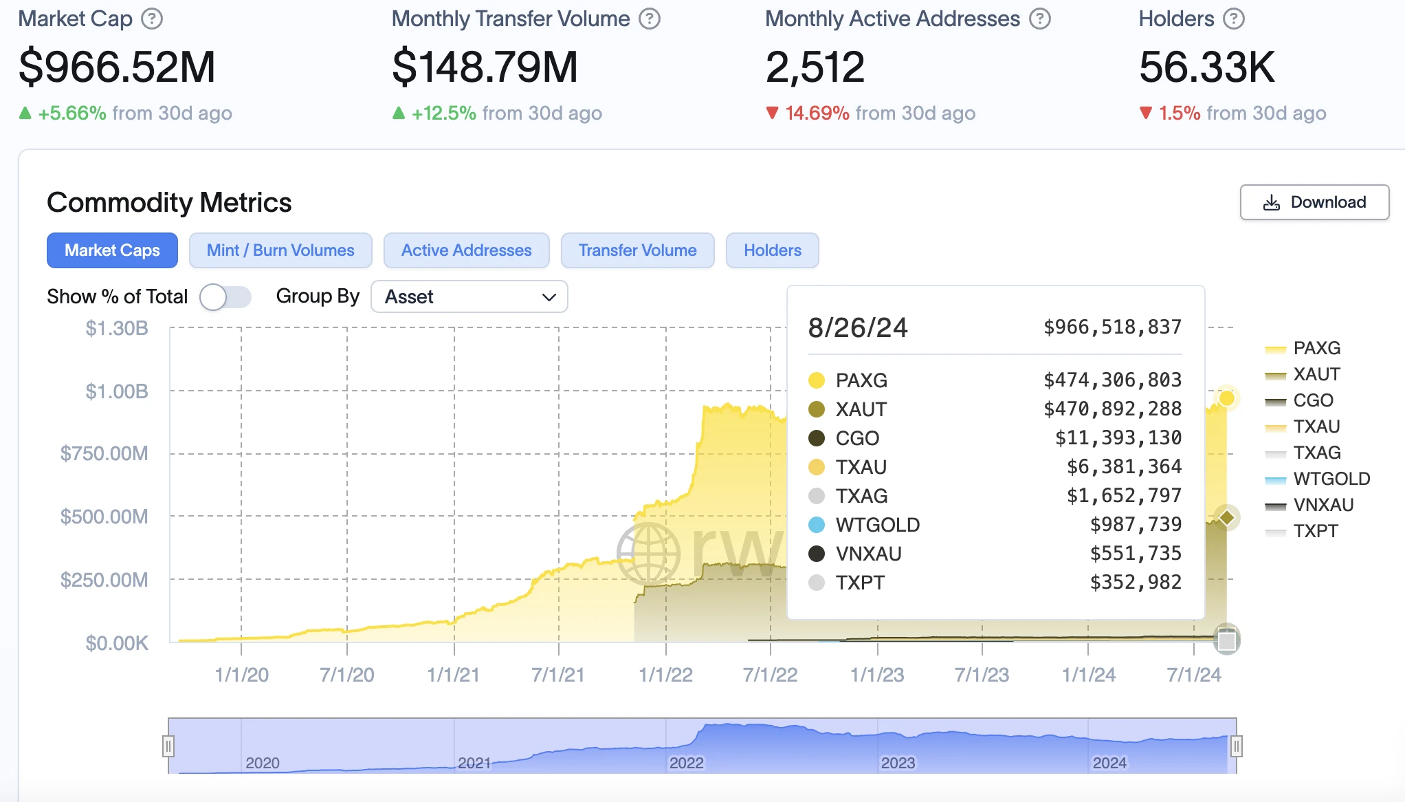 自然资源代币化,代表实际商品的权益。当前大宗商品代币市场的总市值接近 10 亿美元,其中贵金属(特别是黄金)获得了最多的关注。PAX Gold (PAXG) 和 Tether Gold (XAUT) 等黄金支持的稳定币占据了代币化商品市场市值的近 98% 。随着黄金价格突破每盎司 2, 500 美元,全球黄金的总市值已超过 13 万亿美元,也为黄金的代币化和在 DeFi 平台中的集成提供了巨大的市场空间。