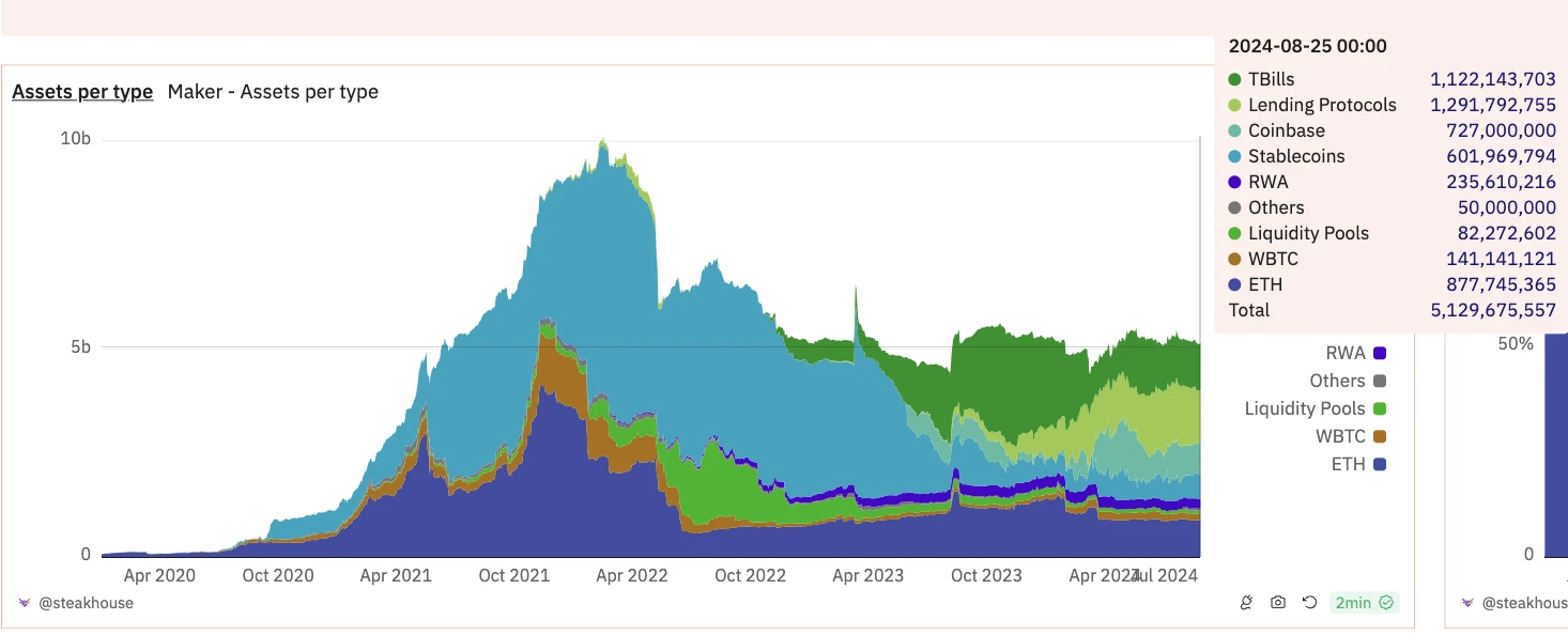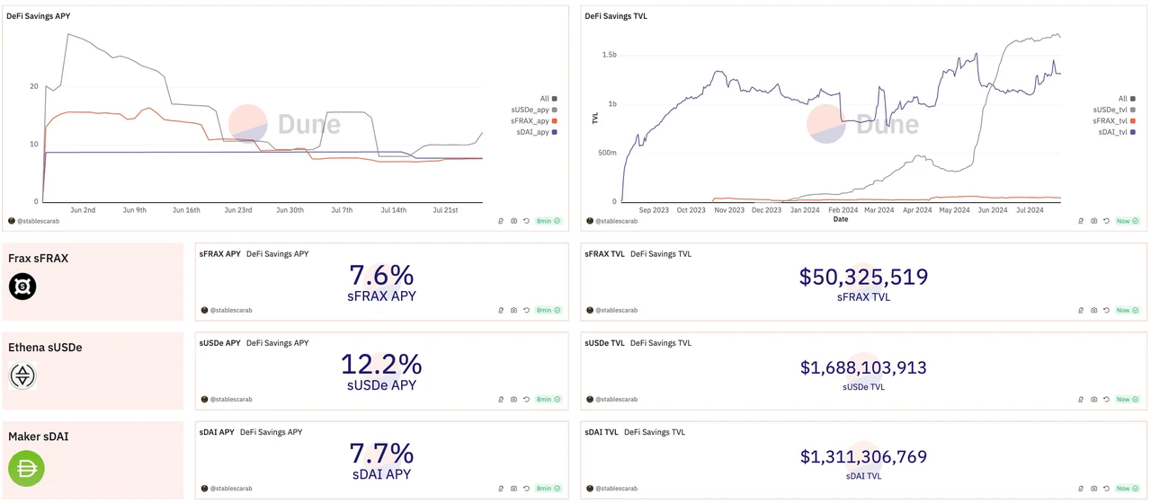 Maker (now Sky): APY 7.7% , 当前 sDAI TVL 约 13 亿;存入 DSR 的 DAI 超过 20 亿,是市面上流通的所有 DAI 的 38% ,自去年 8 月创始人 Rune 宣布提供高达 8% 的收益率以来存款提升 197% ,市值稳定在 50 亿美元出头。抵押品 TVL 为 77.4 亿美元,抵押率为 147% 。Maker 将美国国债整合到其投资组合中,使其收入来源多样化并增强了收入稳定性。整合质押 stETH 并将其作为抵押品来铸造 DAI。还解除了质押的 15% 削减惩罚,促进稳定性并使持有者的利益与生态系统的可持续性保持一致。