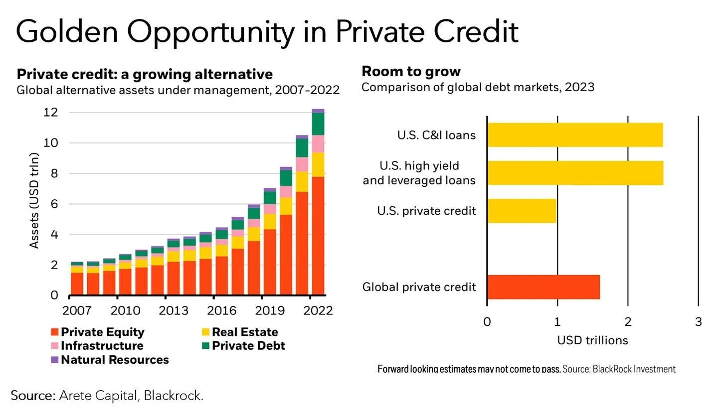 私人信贷作为另类资产的一部分,已经在过去十几年中显著增长,尽管目前在全球债务市场中的占比还相对较小,但其作为一个不断扩大的市场,具有巨大的增长空间。