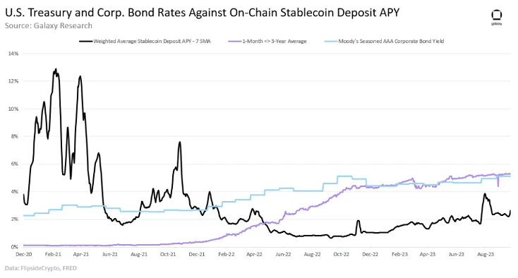 1. 收益率:短期美国国债 > AAA 公司债券 > DeFi 稳定币存款 (代币化国债吸引力强)