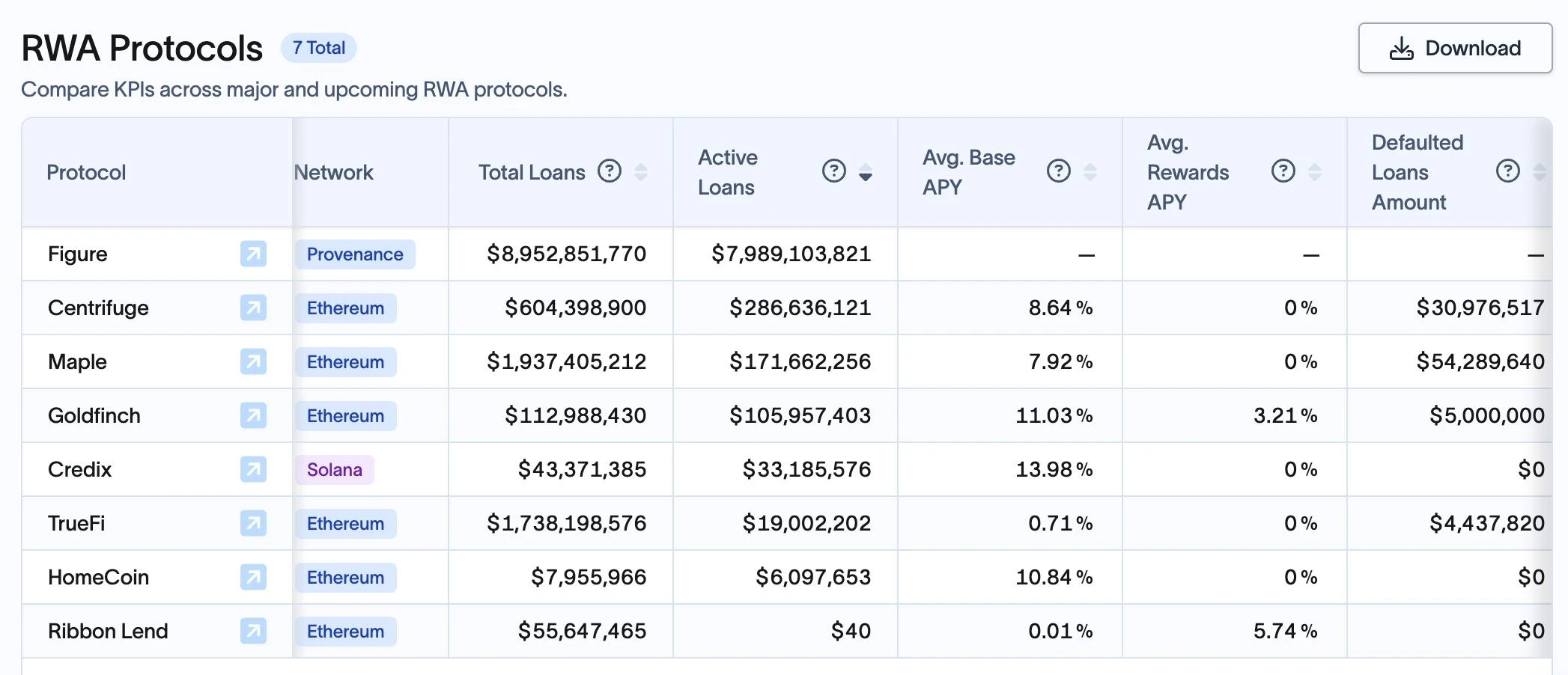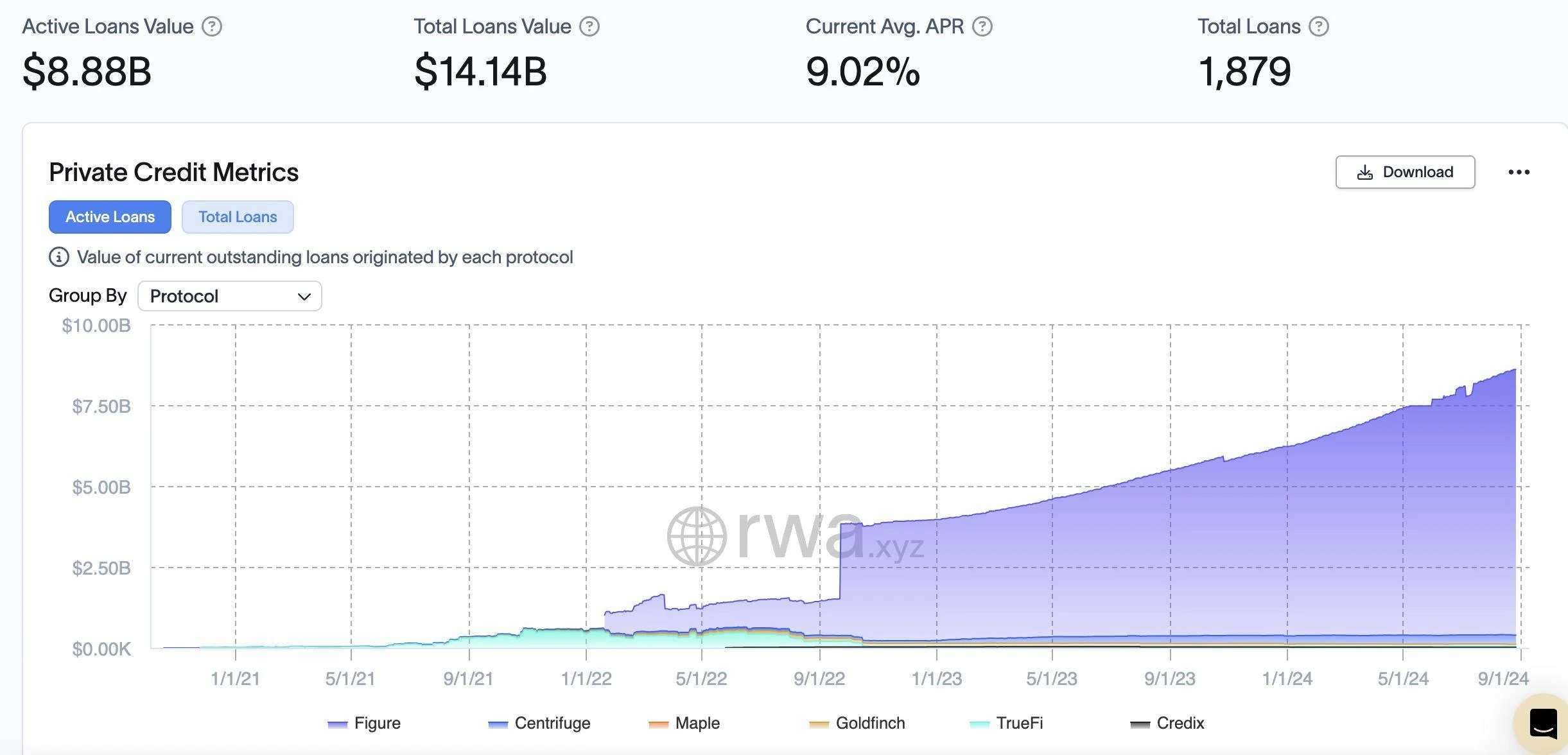2. 当前有近 15 家主流发行商提供超过 32 种代币化的美债相关产品,资产总额超过 20 亿美元,相比年初有了 1627% 的增长。主流的六种链上信贷协议 Figure, Centrifuge, Maple, Goldfinch, TrueFi, Credix 等合计活跃贷款总额 88.8 亿美元,较年初增长 43% 。
