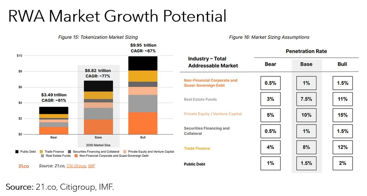 RWA 链上资产规模约 120 亿, 加上稳定币市值总体超过 1800 亿美元。通过区块链技术,将传统金融资产数字化,不仅能够提高透明度和效率,还能吸引更多用户进入这个新兴市场。根据 21.co,花旗以及 IMF 的报告, 2030 年代币化资产的总价值在基本市场情况下预计有机会增长到 6.8 万亿美元。