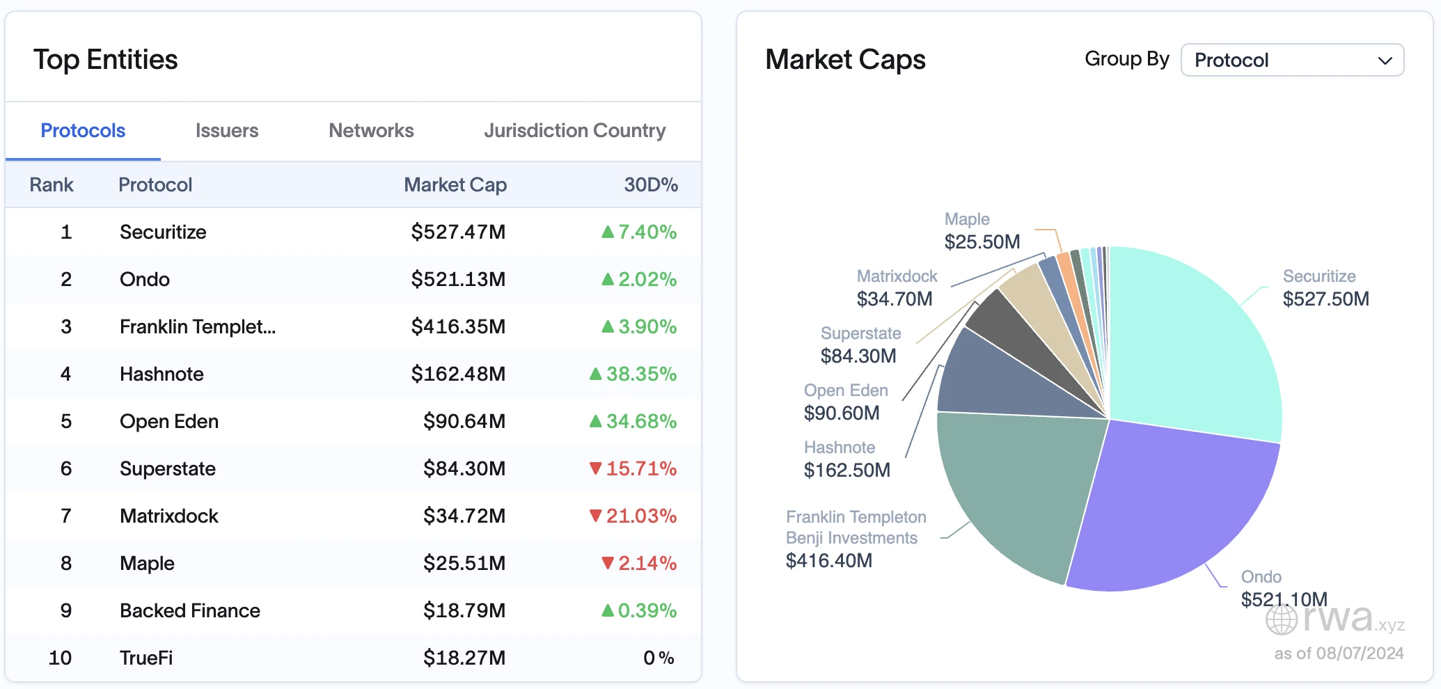 按照市值来看,前 5 名的协议分别是 Securitize, Ondo, Franklin Templeton, Hashnote 以及 OpenEden;而单个产品发行最高是: