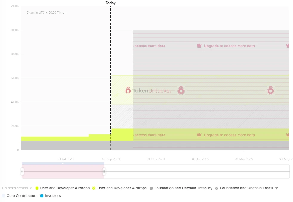Mode 本次解锁面向“用户和开发者空投”,共计 5 亿枚,价值约 633 万美元,由于 Mode 当前仅进行过一次解锁,流通比例为 13% ,所以解锁比例巨大。但后续半年以上不再有新增解锁份额。