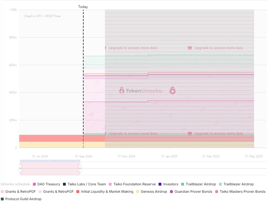 本次代币解锁全部面向 Taiko Trailblazer 空投,共 1200 万枚代币,价值约 1968 万美元。由于当前解锁比例仅为 9% ,所以影响较大。下一次解锁将在 12 月进行。(Odaily 注:Trailblazer 是 Taiko 推出的主网激励活动。)