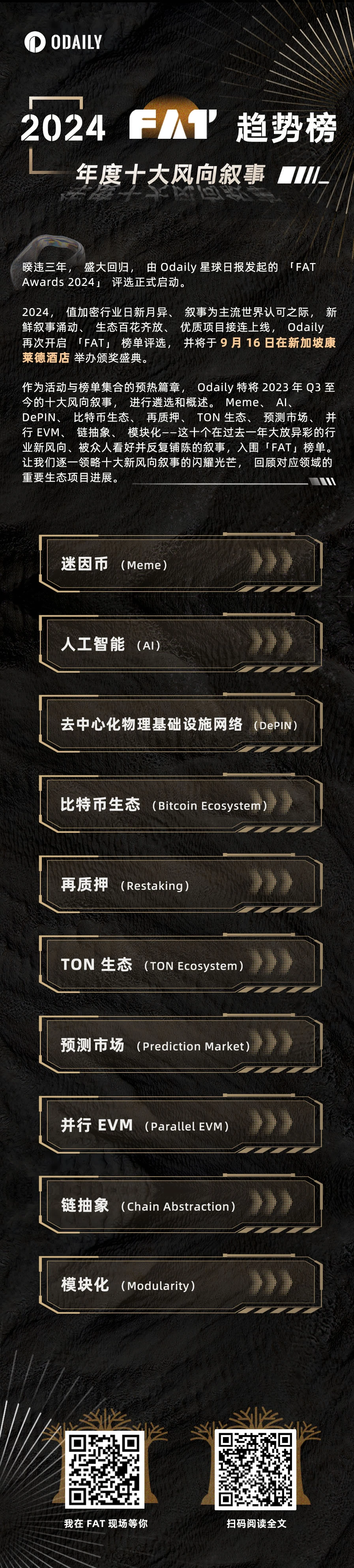2024 ,值加密行业日新月异、叙事为主流世界认可之际,新鲜叙事涌动、生态百花齐放、优质项目接连上线, Odaily 再次开启「FAT」榜单评选,并将于 9 月 16 日新加坡 Conrad Centennial 举办高峰论坛与颁奖盛典。