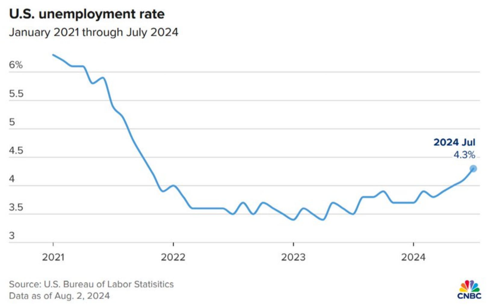 由于美国失业率在 7 月上升至 4.3% ,Sahm 规则预示着经济衰退的可能性。
