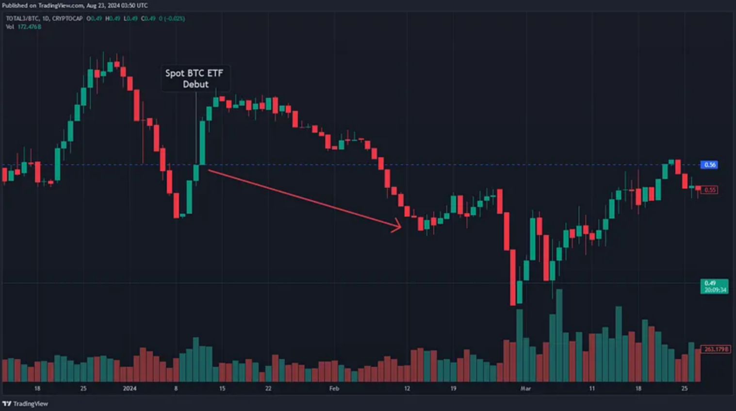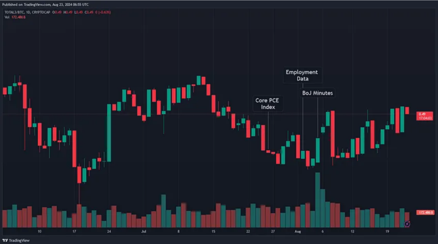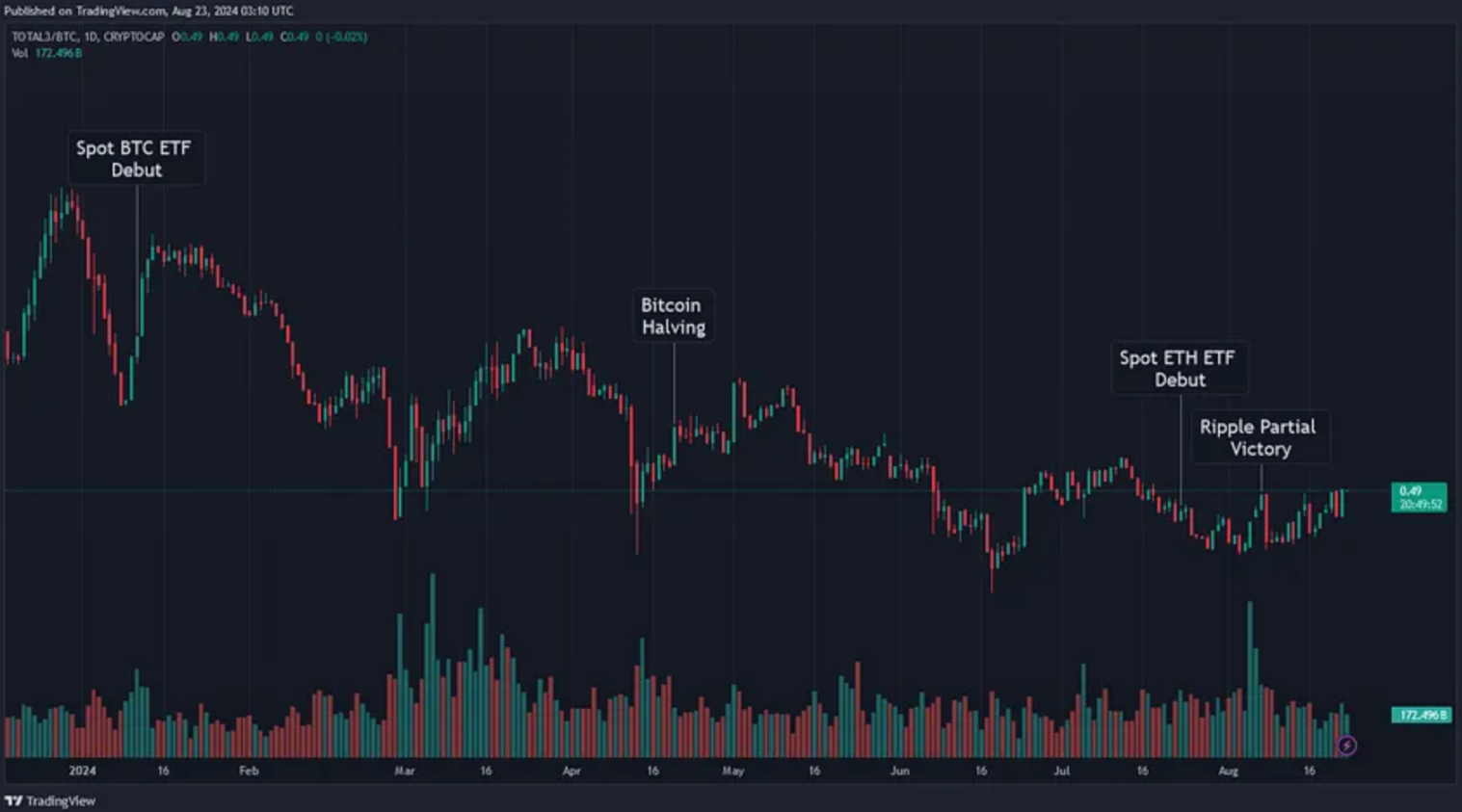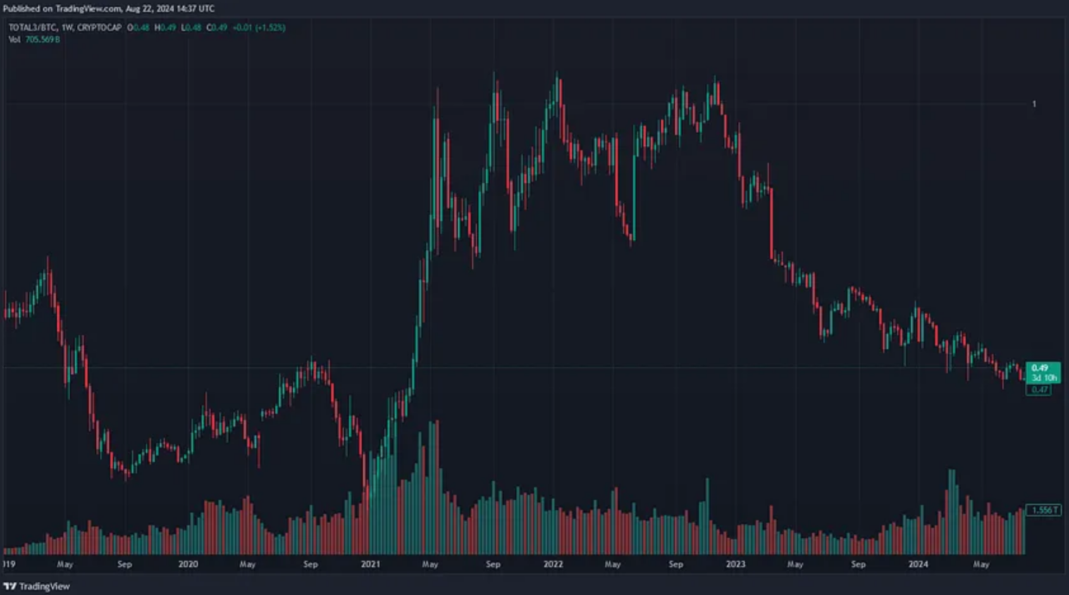 自 2022 年 11 月以来,山寨币表现一直不佳,正如 TOTA L3/BTC 所显示的那样。