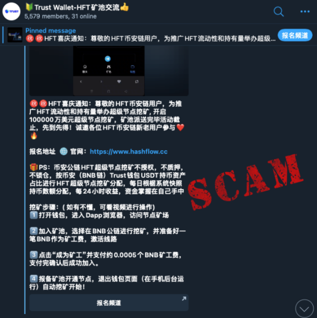 下图中的骗局则是通过诱导用户进行恶意授权,从而盗取用户资金。骗子冒充官方声称有「超级节点挖矿活动」,邀请用户参与挖矿。用户按照操作指南点击钓鱼链接后,被诱导进行恶意授权,最终导致资金被盗。