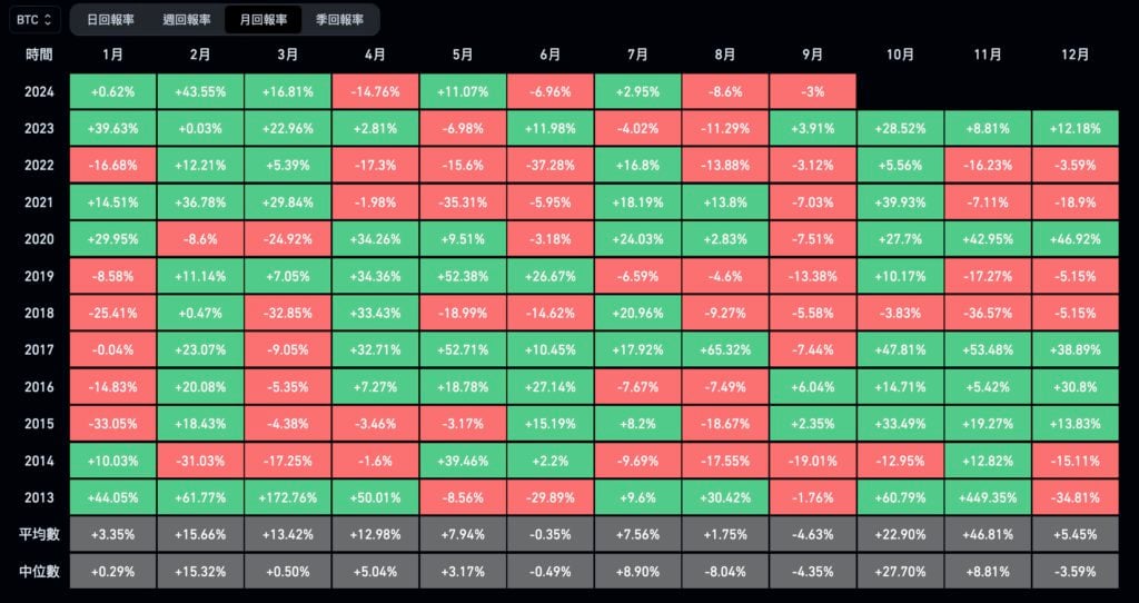 另一方面,根据过去十年(2014 年至 2023 年)那斯达克指数的表现来看,9 月份也有 8 次出现下跌,下跌机率高达 80%。由于加密货币与美股之间存在一定程度的关联性,因此可能也会受到影响。