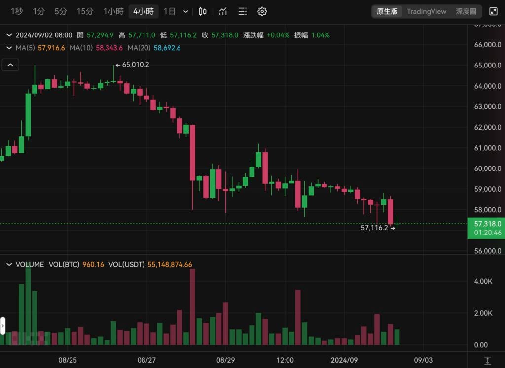 比 特币自从 8 月 26 日短暂触及 6.5 万美元之后就一路跌跌不休,今(2)日清晨更再度跳水最低下杀 57,116 美元,创下两周以来最低。
