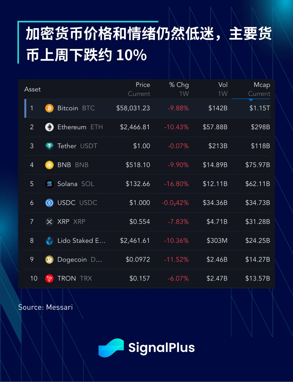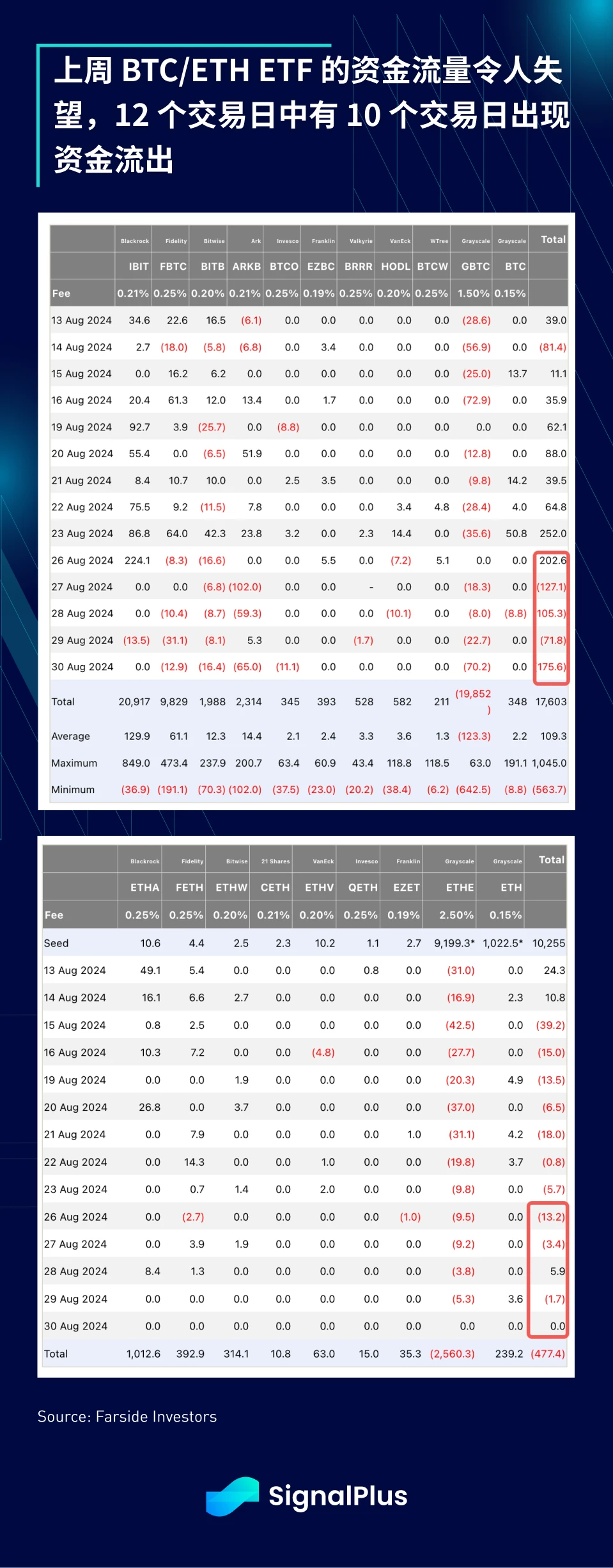 加密货币度过了平静的一周,但表现仍令人失望,主要货币和 altcoins 均下跌 10% 左右。此外,TG 创始人 Durov 在法国被捕以及 SEC 对 Opensea 的最新行动也使整体情绪受到打击,加上 BTC 和 ETH ETF 的资金持续外流(过去 12 天中有 10 天出现流出),市场几乎无事可庆。