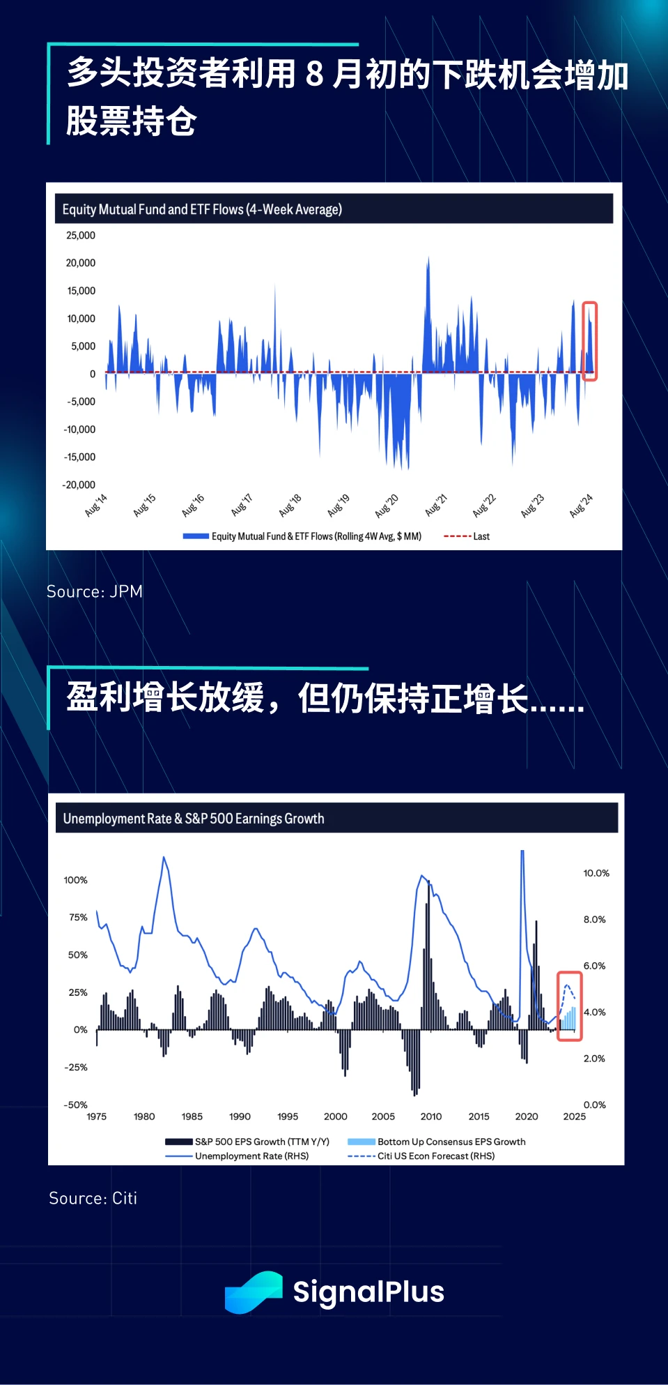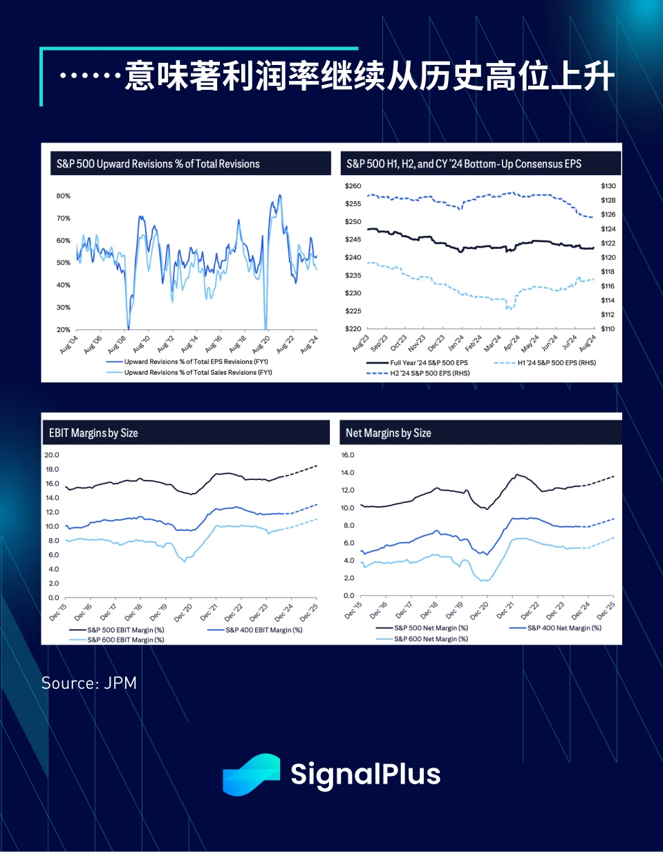 在股票市场方面, 8 月初市场下跌后,多头投资者和共同基金投资者大规模买入,投资者仍对股票市场抱有信心,SPX 企业盈利迄今也仍持续增长。此外,基本面仍然非常健康,尽管经济存在各种不确定性,企业依旧能够找到方法保持盈利能力,已经处于较高水位的 EBIT 和净利润率仍持续上升。