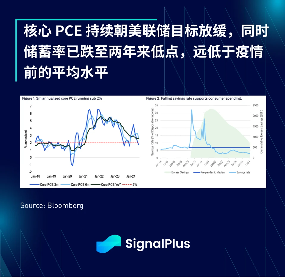 核心 PCE 通胀环比增长 0.16% ,同比增长 2.6% ,个人支出数据相当健康,环比增长 0.4% ,然而,支出强劲在很大程度上是由美国储蓄率持续下降所推动的,储蓄率目前已降至 2.9% ,处于 2022 年 6 月以来的最低点,且低于疫情前的平均水平。