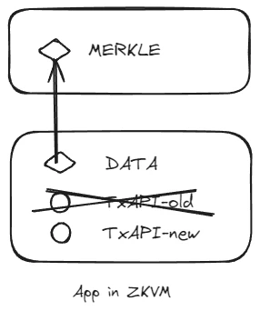要解决这个问题,首先是要解决数据复用问题和数据升级问题。当游戏的逻辑修改,我们仍然希望原来的数据可以原封不动被保留。这里的最佳零成本解决方案,是独立的 App As A rollup。因为在 App rollup 中,原先数据的默克尔根可以直接复用,而对逻辑的修改只需要体现在代码逻辑中。
