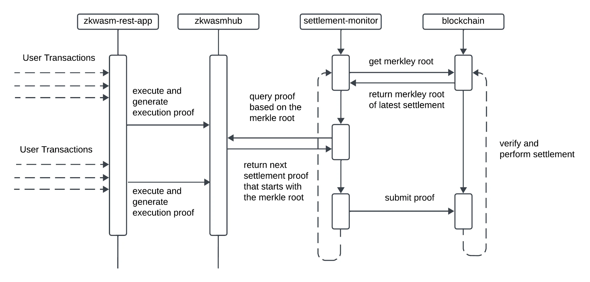 其核心流程是:接收交易、在 WASM 虚拟机中处理交易、使用 zkWASM 云服务生成证明,最后将证明提交到区块链进行验证和结算。整个过程保证了交易的隐私性和安全性,同时大大提高了区块链的扩展性。开发者只需关注应用逻辑,而不必深入理解复杂的零知识证明技术细节。它还包含了一个 Rollup 监控系统,可以使用证明和交易数据触发链上结算,通过存储 Merkle 根和 verify API 来验证证明,确保按照链上 Merkle 根的顺序进行结算。此外,该 SDK 还简化了本地开发环境的搭建,只需启动 MongoDB 和 Redis,运行 dbservice,然后在 ts 目录下执行 npm run server 即可启动完整的本地服务。