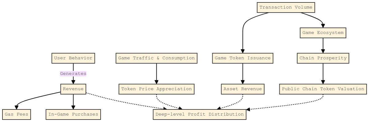 收益关系会更为复杂,且隐藏着更深层次的利益分配问题:一方面,用户行为会产生收益,包括链的 gas 收益,游戏内容消费收费;另一方面,游戏流量和消费带来了币价增值,有交易量的游戏通过发行游戏代币产生了资产收益,同时也给链带来了繁荣的生态效应,进一步增加了公链的代币估值预期。