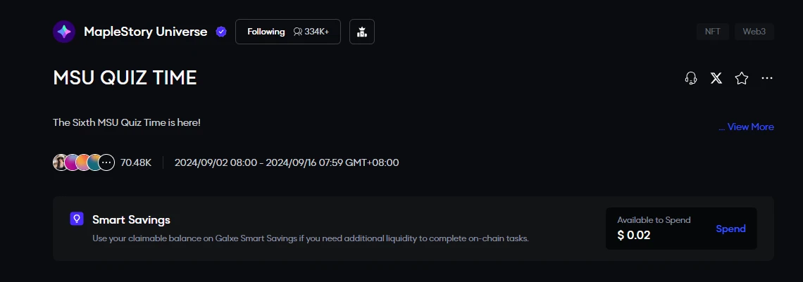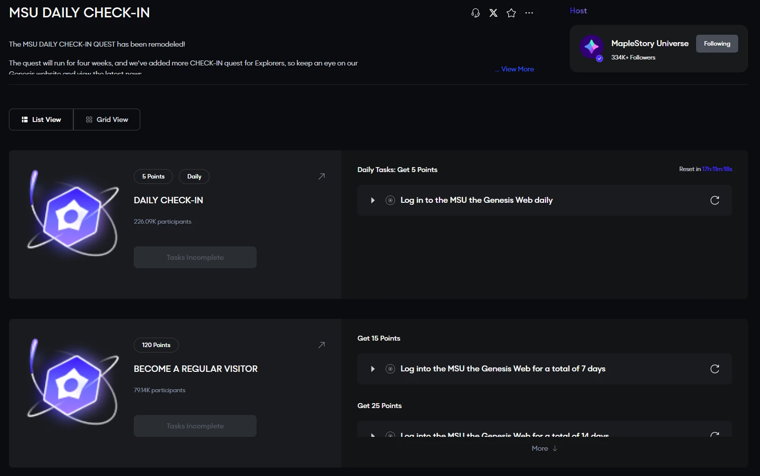 目前,MapleStory Universe 主要需要坚持参与交互的是在 Galxe 上的任务,一个是日常签到任务( 点击此处跳转链接 )。
