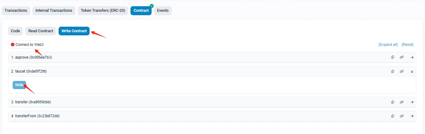 STEP 2. 领取 Sepolia 的 FAUCET 代币:进入区块链浏览器( 点击此处跳转链接 )后,连接钱包、点击 Write、完成钱包签名。