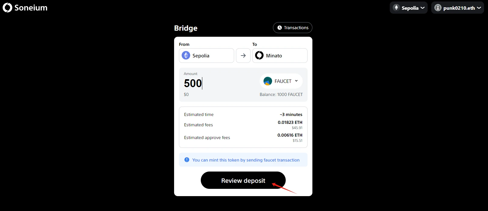STEP 3. 将 FAUCET 从 Sepolia 跨至 Minato。