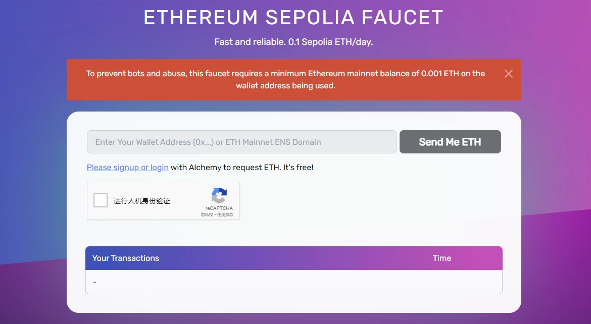 STEP 1. 领取测试币 Sepolia ETH,需要钱包在 ETH 主网持有最少 0.001 ETH。( 点击此处跳转测试币领取链接 )