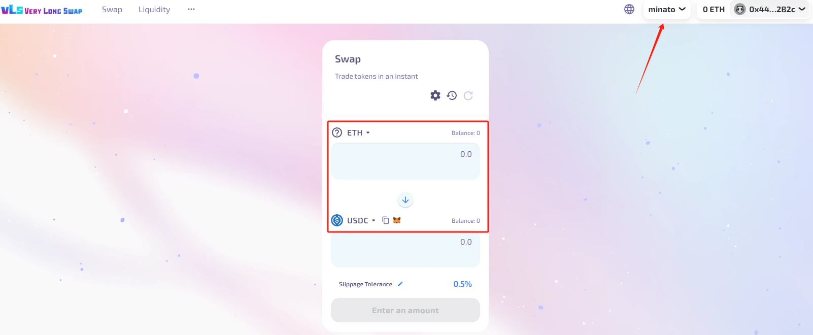 STEP 1. 进入 Swap 交互网站,兑换少量 USDC( 点击此处跳转链接 ),网络需切换到 Minato 网络。