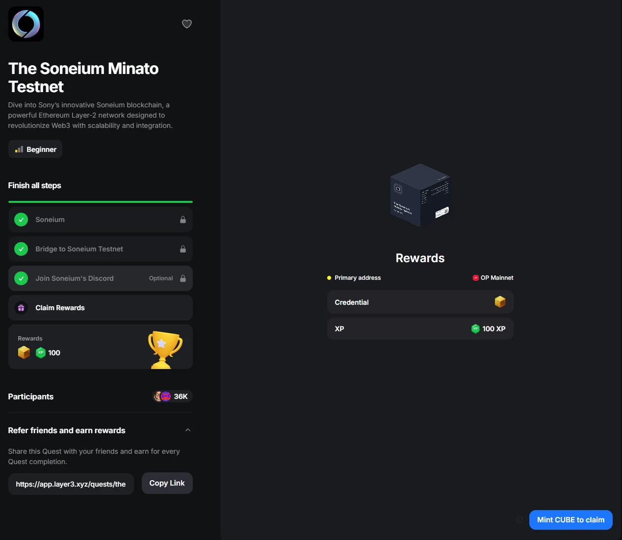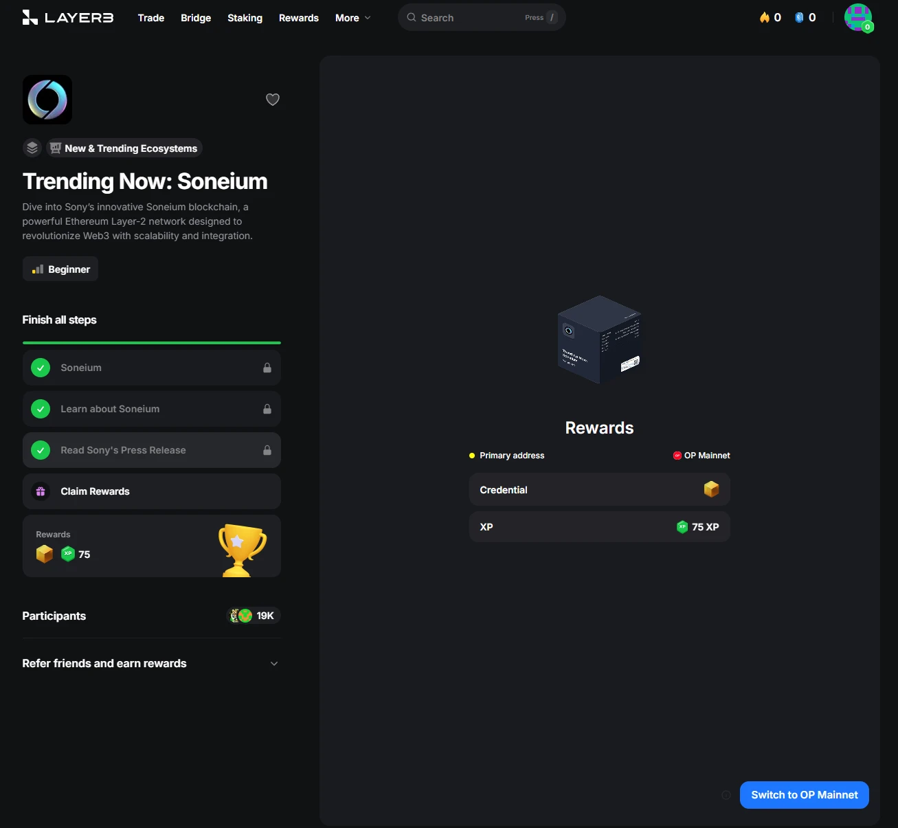 任务三:完成 LAYER3 合作任务,共有两个任务,任务一为简单浏览指定网站即可( 点击此处跳转链接 )、任务二需要进行跨链交易、进入官方 Discord( 点击此处跳转链接 ),需要在 OP 链有少量 ETH 来领取奖励。
